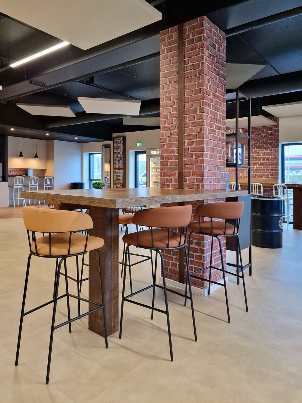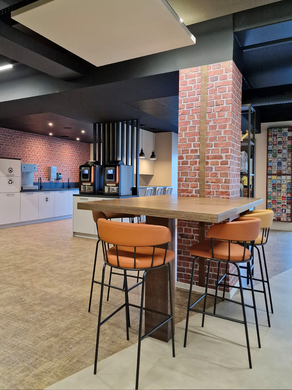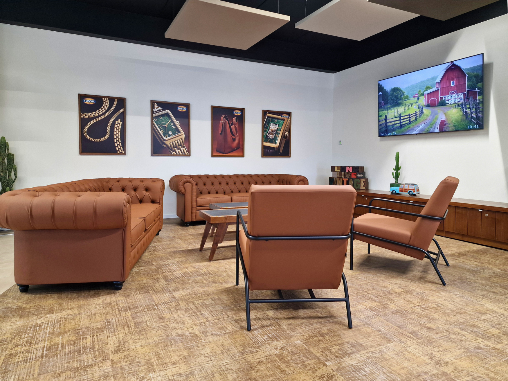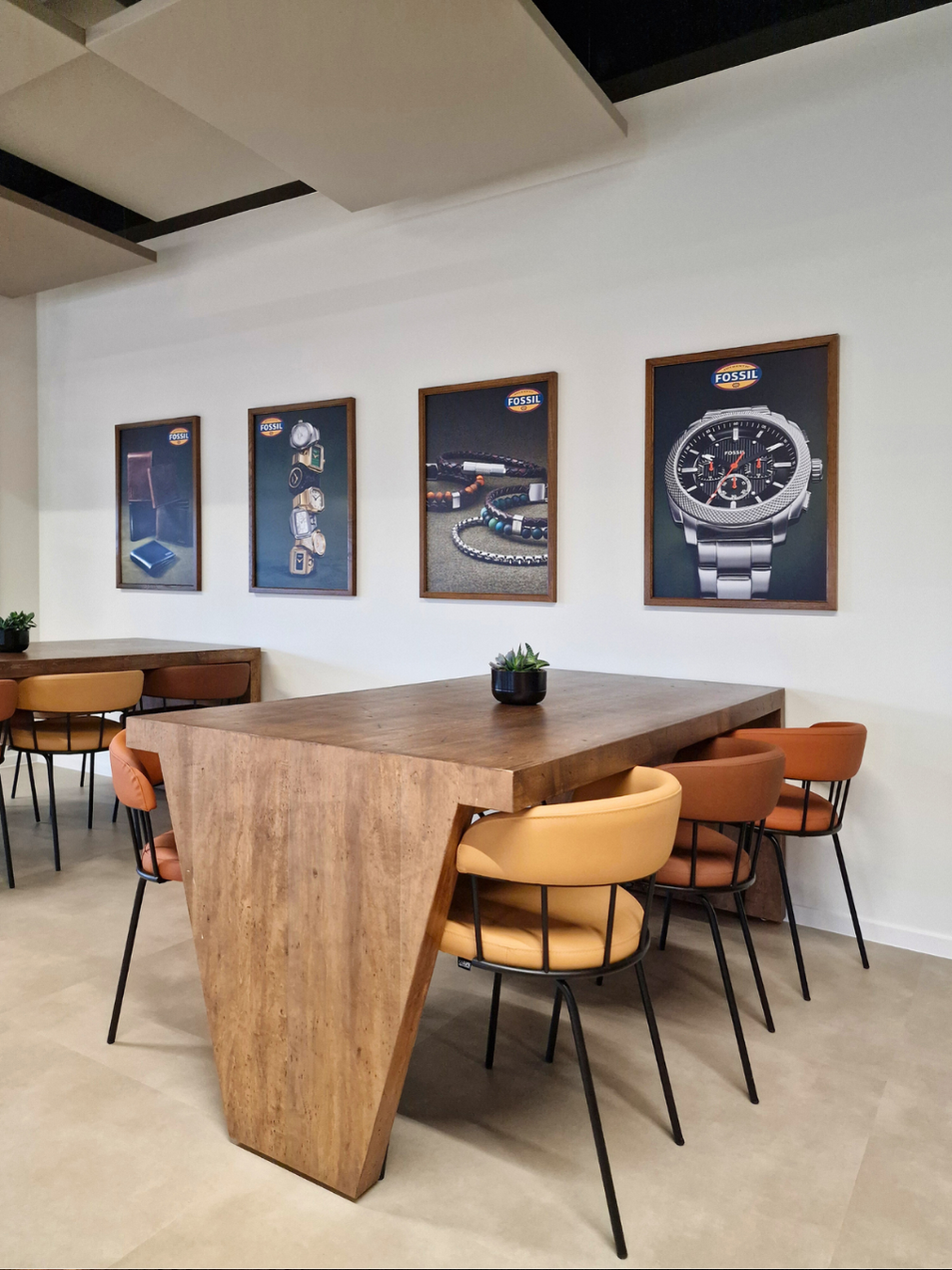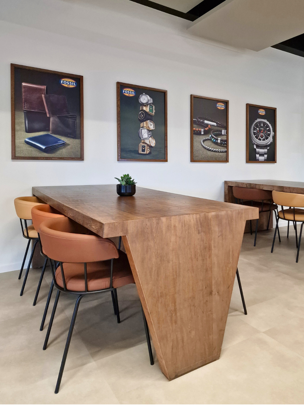 Nous avons imaginé un lieu chaleureux, accueillant, avec une vraie identité en cohérence avec l’univers Fossil. Le choix des matériaux, des couleurs et du mobilier contribue à créer une atmosphère authentique, propice aux rencontres informelles et à la convivialité.